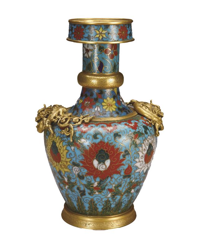 掐丝珐琅缠枝莲纹盘龙瓶(元)。