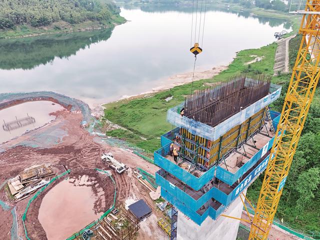 近日,记者在S406明月渠江大桥(明月渡改公路桥)项目现场看到,工人们正在进行桥墩施工。