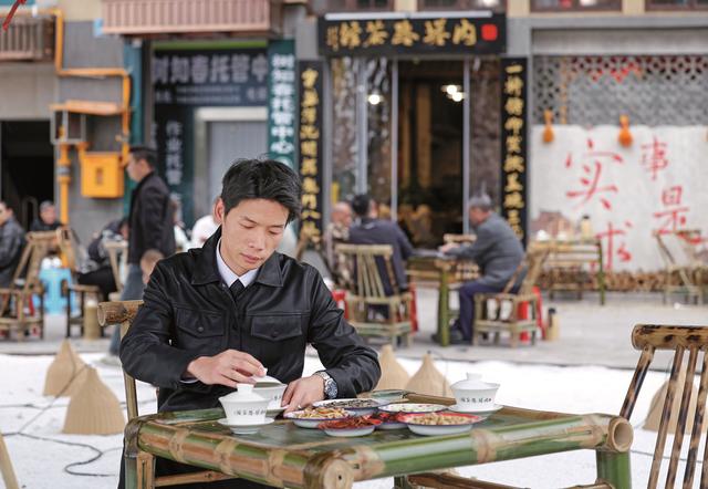“广安人待客,茶是礼数”醒目的红字被贴在前台点单的黑板上,上面还有5元、6元、10元定价的小吃、茶水价格明细。茶馆的中间是戏台子,左侧是“饮食店”、右侧是“供销社”和非遗作坊,充满年代感,这都是因为罗子雄他们“不想只做一个‘卖茶的地方’,更想打造一个广安人的文化空间”。