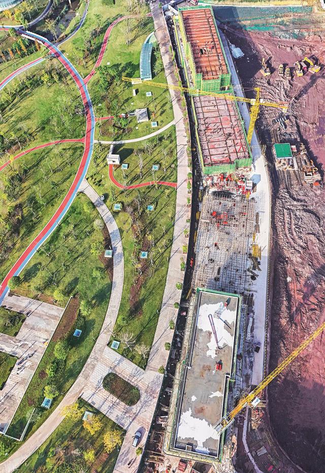 11月29日,航拍的岳池县城东新区的万达广场项目建设一角。