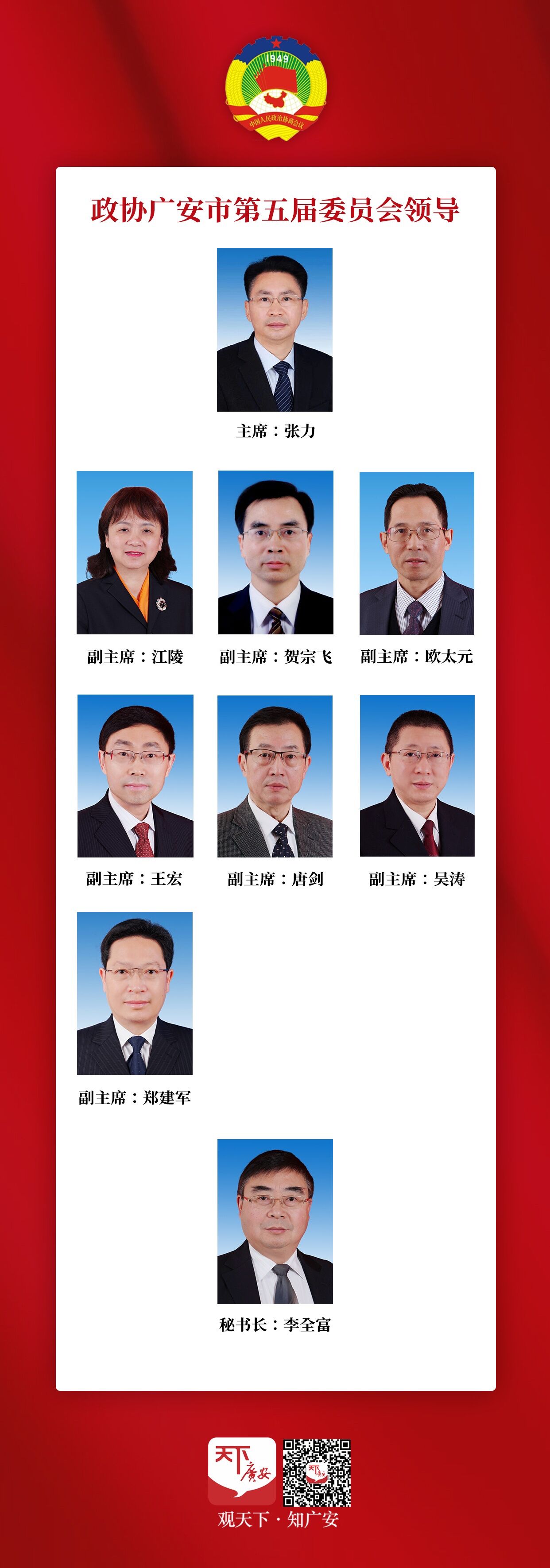 在闭幕会前举行的选举大会上,张力当选为市政协主席,王才、冯中华、刘娟、何君、易佑文、胡锵、夏兴初、蒙焱雄、熊良平委员当选为政协广安市第五届委员会常务委员。
