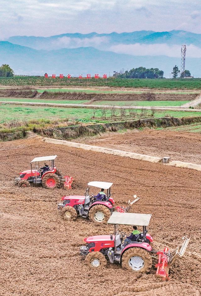 图为2月3日,华蓥市华龙街道东方村村民驾着“铁牛”在田间“犁春牛”。