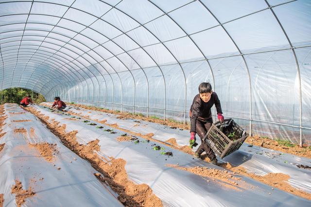 2月10日,广安区浓溪镇全民村村民在大棚内栽种辣椒苗。