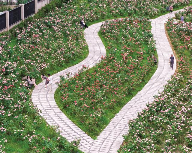 7月21日,广安区滨江月季园中满园的月季花盛开,吸引市民前来游玩打卡。