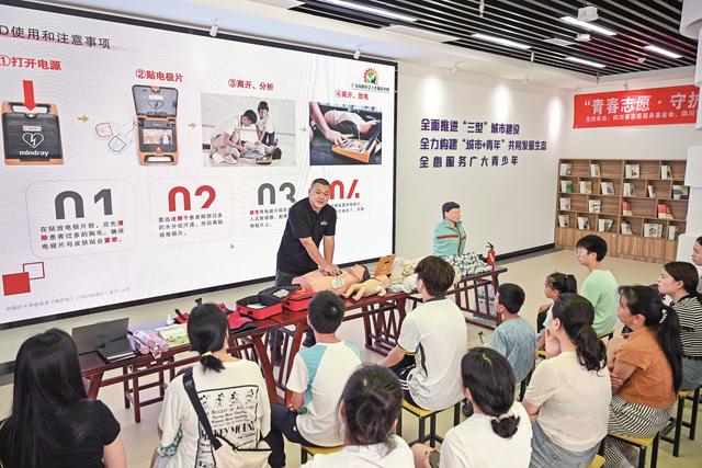 7月6日,在市青少年宫,广安向阳社会工作服务中心志愿者正在向青少年及其家长示范讲解心肺复苏急救知识。
