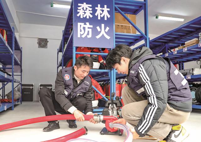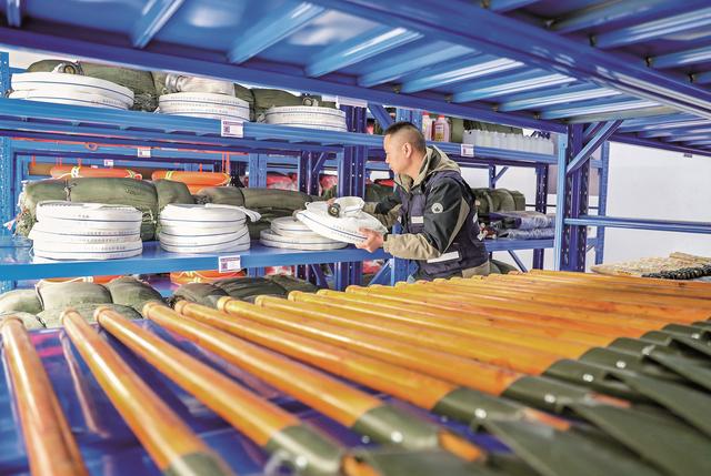 12月8日,应急救援人员在库房存放应急救援装备。