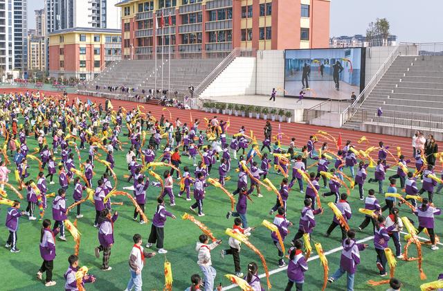 重庆市人民小学广安学校学生练习舞彩带龙。