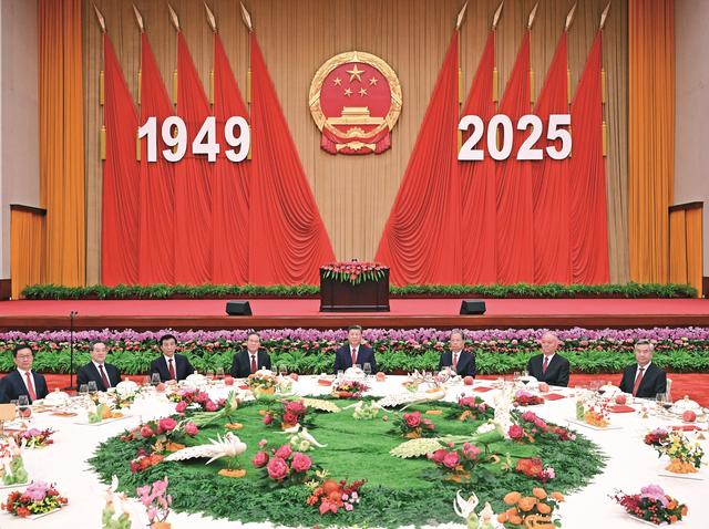 人民大会堂宴会厅华灯璀璨,洋溢着喜庆热烈的节日氛围。主席台上方高悬着庄严的国徽,“1949-2025”大字年号在鲜艳红旗映衬下格外醒目。