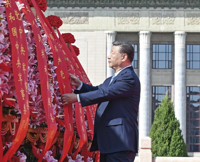 习近平迈步上前,仔细整理花篮缎带。随后,习近平等党和国家领导人缓步绕行,瞻仰人民英雄纪念碑。