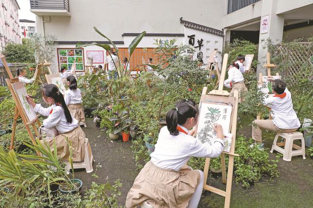 学生在百草园写生,创作中草药水彩画。