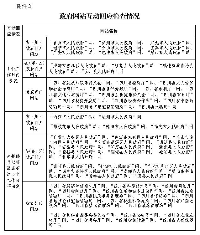 (三)互动交流畅通有效。全省政府网站更加重视在线互动交流,网络问政渠道进一步畅通。绝大多数政府网站公开了网民留言,88%的政府网站主动公开了留言时间、答复内容、答复时间、答复单位等信息。大多数政府网站能在5个工作日内对简单常见咨询作出答复。广元、广安市政府门户网站实现了互动模块统一登录,广元市畅通了办事和互动模块一号登录。宜宾、攀枝花、巴中、南充等市政府门户网站探索建立专属用户空间,方便用户回顾咨询问题、在线办事、浏览网页等历史信息。