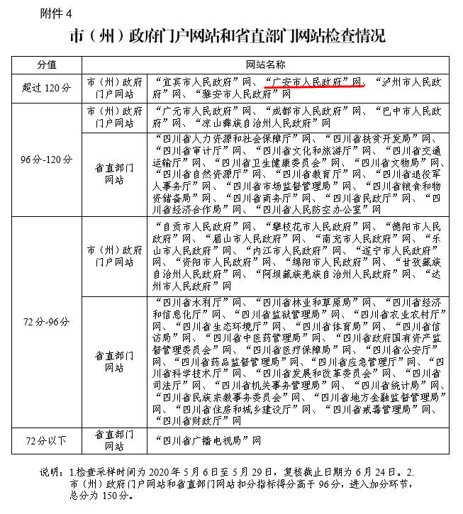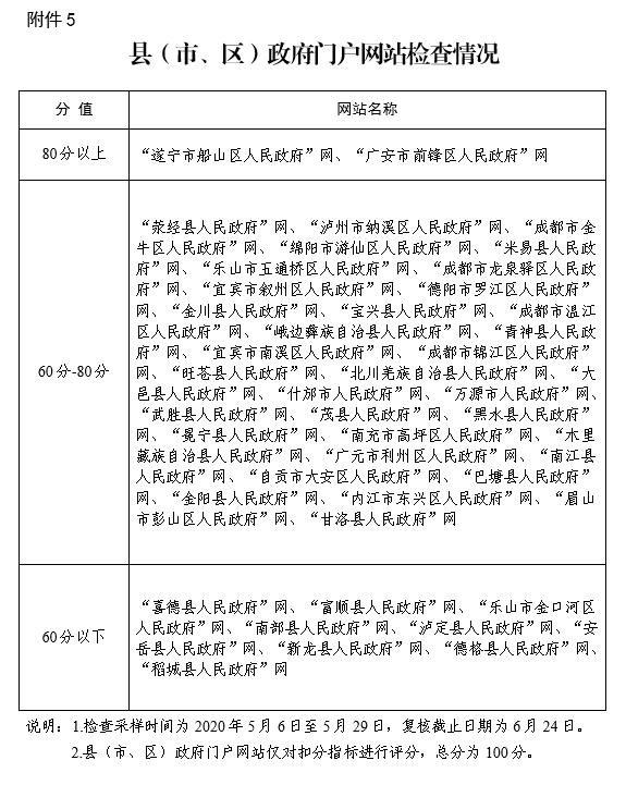 (二)上半年度检查结果。依据检查指标,对21个市(州)和41个省直部门政府网站,开展了单项否决、扣分指标和加分指标检查。对1/4的县(市、区)政府门户网站,开展了单项否决和扣分指标检查。受检的政府网站总体合格率91%,宜宾、广安、泸州、雅安市和遂宁市船山区、广安市前锋区政府门户网站得分靠前,人力资源社会保障厅、省扶贫开发局、审计厅、文化和旅游厅、交通运输厅、省卫生健康委、省文物局、自然资源厅、教育厅、退役军人厅等省直部门网站总体情况较好。