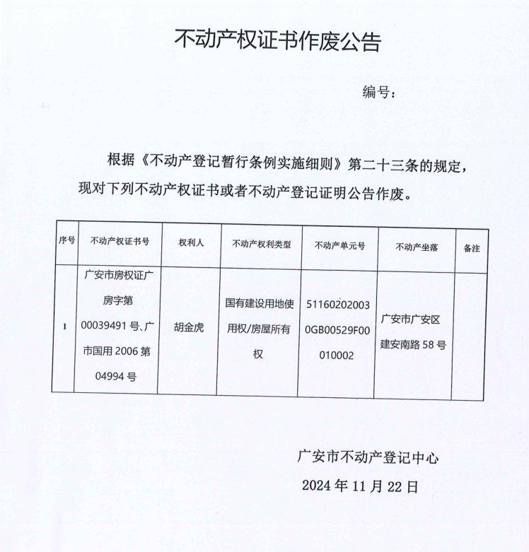 不动产权证书作废公告(胡金虎)