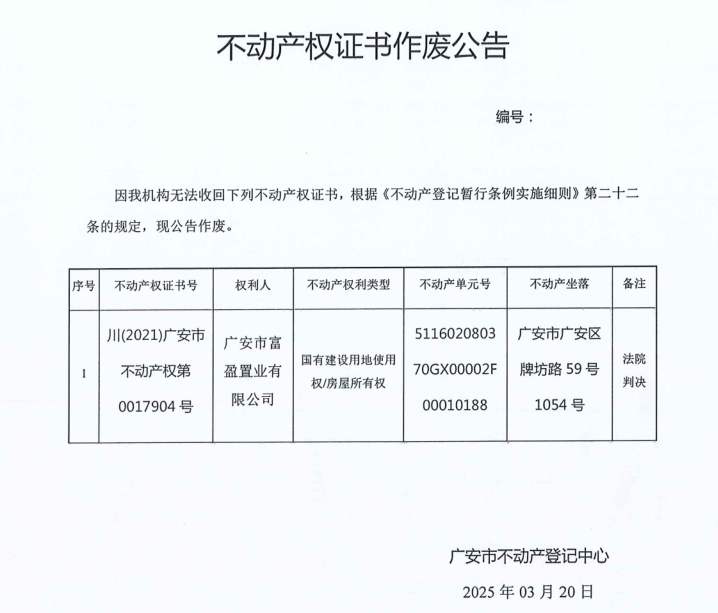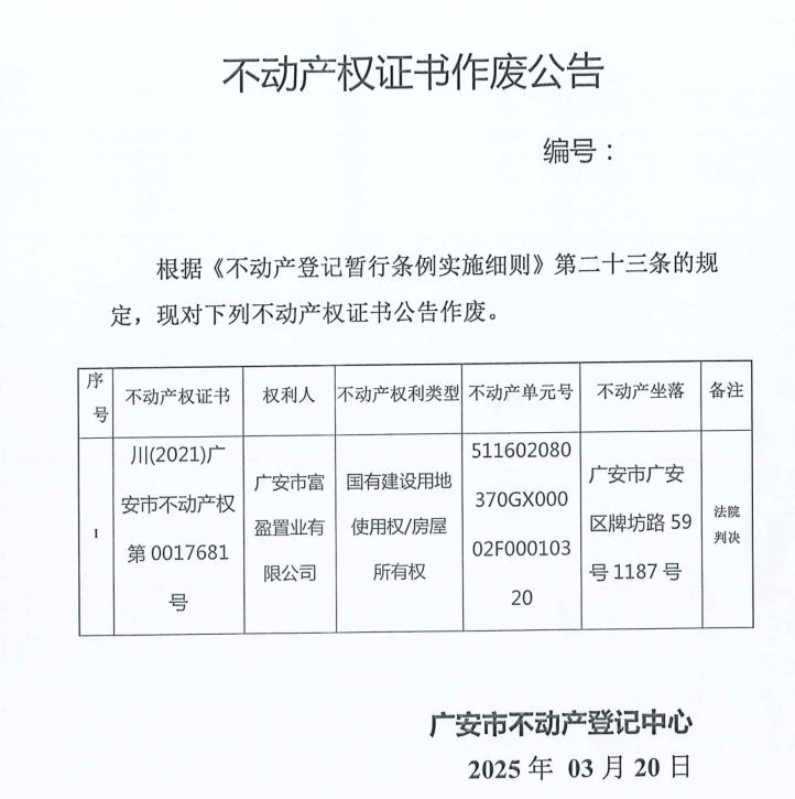 不动产权证书作废公告(广安市富盈置业有限公司)