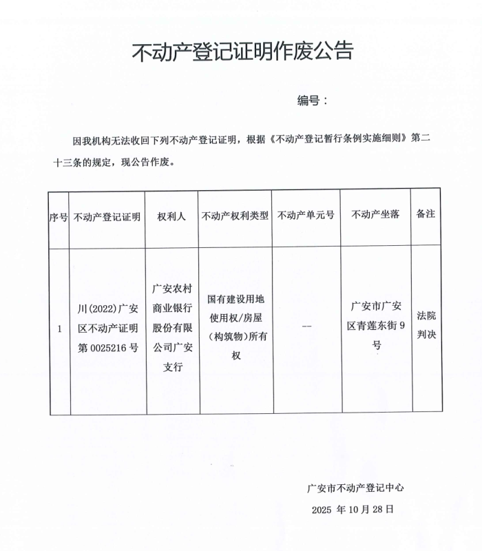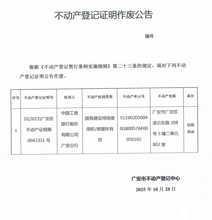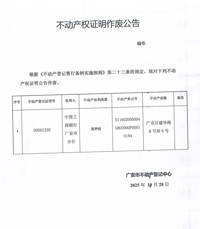 不动产权证明作废公告(中国工商银行广安市分行等)