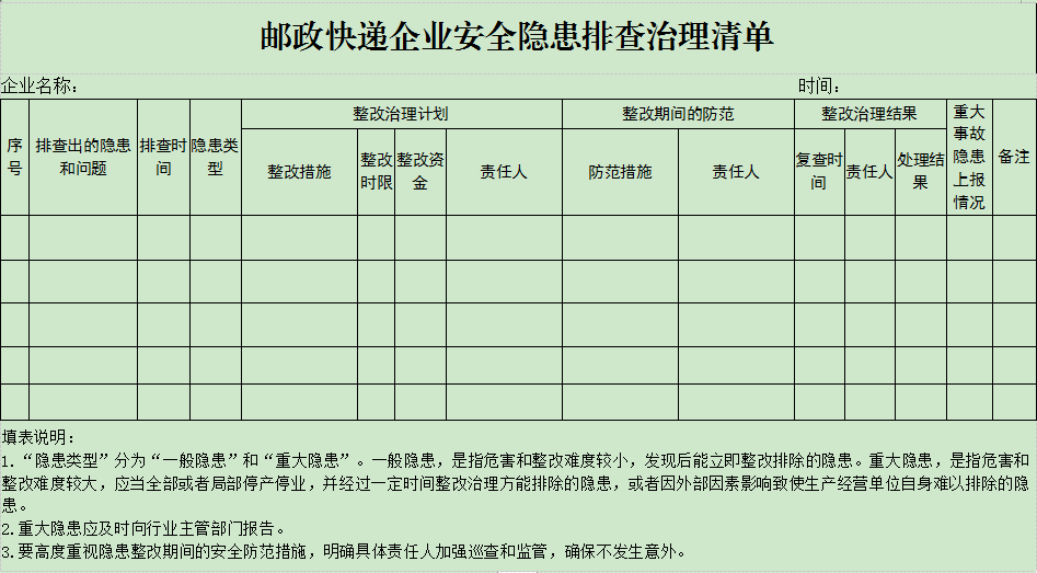 五、持续开展安全隐患排查整治。即日起至10月10日,各企业要进行安全隐患大排查大整治,特别是要把作业车辆安全、处理场地安全放在重中之重。重点排查:1.常态化疫情防控措施落实情况。2.企业安全生产责任制落实情况。机构建立、人员到位、经常性教育培训、经常性监督检查、及时进行整改等情况。3.人员集中的分拣中心(处理场地)、办公场地的消防安全、作业安全、设施设备安全。4.作业车辆管理、营业场所、员工宿舍等方面安全隐患。5.“三项制度”执行情况。各企业于10月11日前将隐患排查情况广安市邮政管理局。